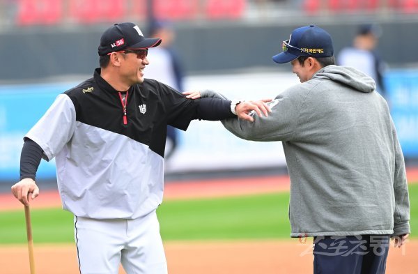 11일 경기도 수원 KT위즈파크에서 ‘2020 신한은행 SOL KBO리그’ KT 위즈와 두산 베어스의 경기가 열린다. 경기 전 훈련에서 KT 박정환 코치와 두산 허경민이 웃으며 인사하고 있다.