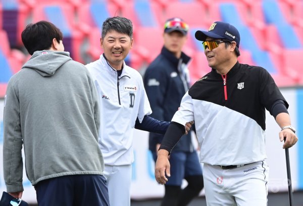 11일 경기도 수원 KT위즈파크에서 ‘2020 신한은행 SOL KBO리그’ KT 위즈와 두산 베어스의 경기가 열린다. 경기 전 훈련에서 두산 김원형 코치, KT 김태균 코치가 박건우와 이야기하며 웃고 있다.