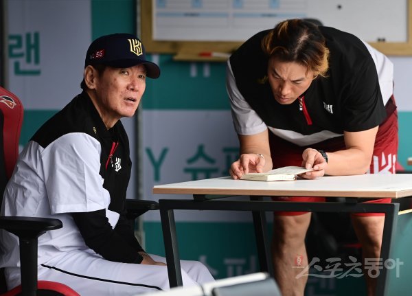 11일 경기도 수원 KT위즈파크에서 ‘2020 신한은행 SOL KBO리그’ KT 위즈와 두산 베어스의 경기가 열린다. 선수들의 경기 전 훈련에서 KT 이강철 감독과 박승민 코치가 이야기하고 있다.