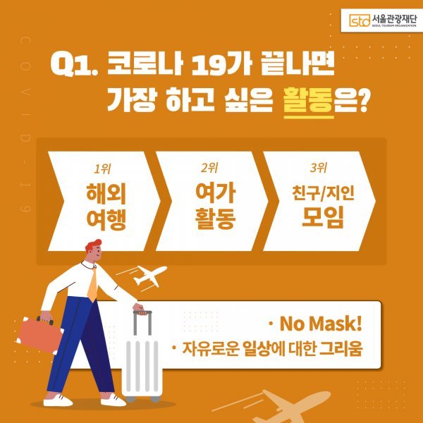 온라인 집단심층인터뷰(FGI)로 진행한 이번 조사에서 신종 코로나바이러스(코로나19) 사태 종식 후 가장 하고 싶은 활동으로는 해외여행을 꼽았다. 이어 여가활동, 친구나 지인과의 모임 순이었다. 관광행태 역시 큰 변화가 있었다. 국내 코로나19 확진자 발생 직후인 1월 말 해외여행 경험자를 제외한 응답자 전원이 해외여행 계획을 취소한 것으로 나타났다.