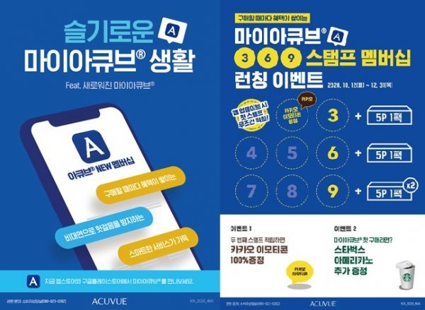 스마트 오더는 필요한 제품을 예약하면 예약제품이 지정 매장에 준비됐을 때 알림톡을 보내주는 기능이다. 보너스 렌즈를 제공하는 ‘3·6·9 스탬프 멤버십’은 아큐브 제품을 구매하면 스탬프가 제품 용량에 따라 1~3개씩 적립되며, 9개의 스탬프를 완성할 때마다 ‘아큐브 오아시스 원데이’ 20알(5알 4팩)을 보너스 렌즈로 받을 수 있다.
