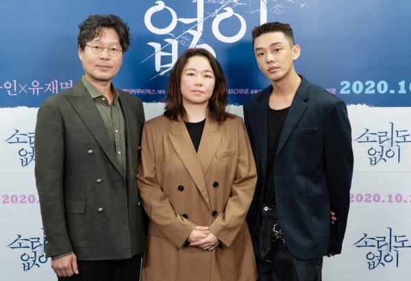 배우 유재명, 감독 홍의정, 유아인(왼쪽부터)이 12일 오후 영화 \'소리도 없이\' 온라인 기자간담회에 참석해 포즈를 취하고 있다.