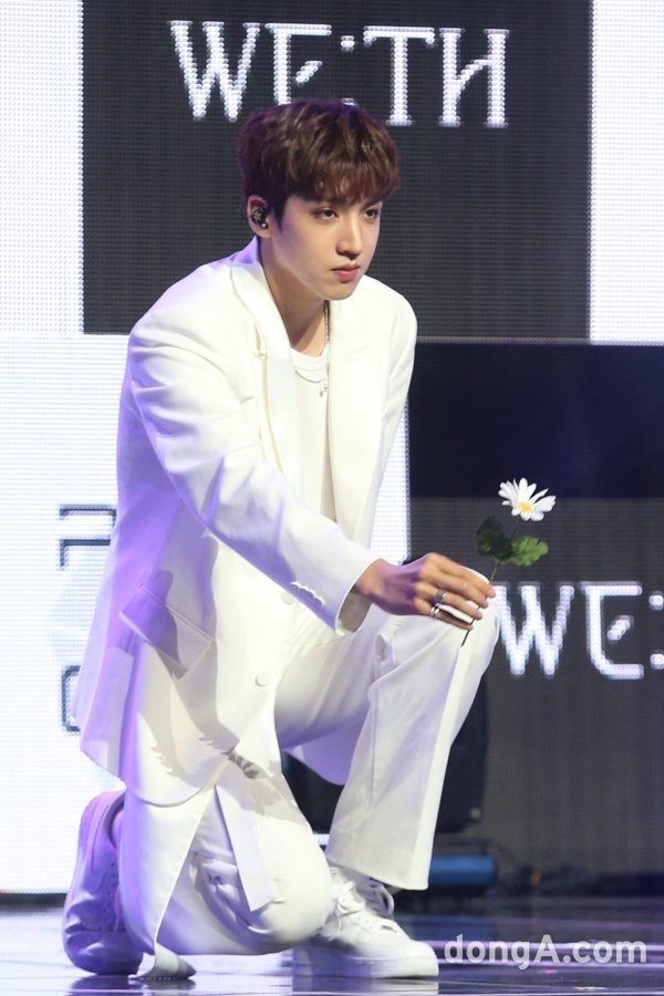 그룹 펜타곤의 우석이 12일 오후 서울 용산구 블루스퀘어에서 열린 미니 10집 앨범 \'WE:TH\' 발매 쇼케이스에 참석해 포즈를 취하고 있다. 동아닷컴 국경원 기자 onecut@donga.com