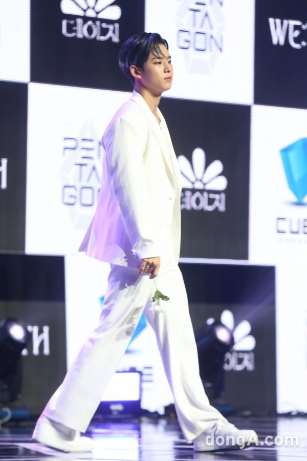 그룹 펜타곤의 우석이 12일 오후 서울 용산구 블루스퀘어에서 열린 미니 10집 앨범 \'WE:TH\' 발매 쇼케이스에 참석해 포즈를 취하고 있다. 동아닷컴 국경원 기자 onecut@donga.com