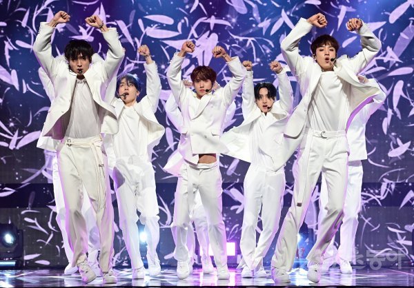 그룹 펜타곤이 12일 서울 용산구 한남동 블루스퀘어 아이마켓홀에서 열린 미니앨범 10집 ‘WE:TH(위드)‘ 발매 기념 미디어 쇼케이스에서 타이틀곡 ’데이지‘ 무대를 하고 있다.