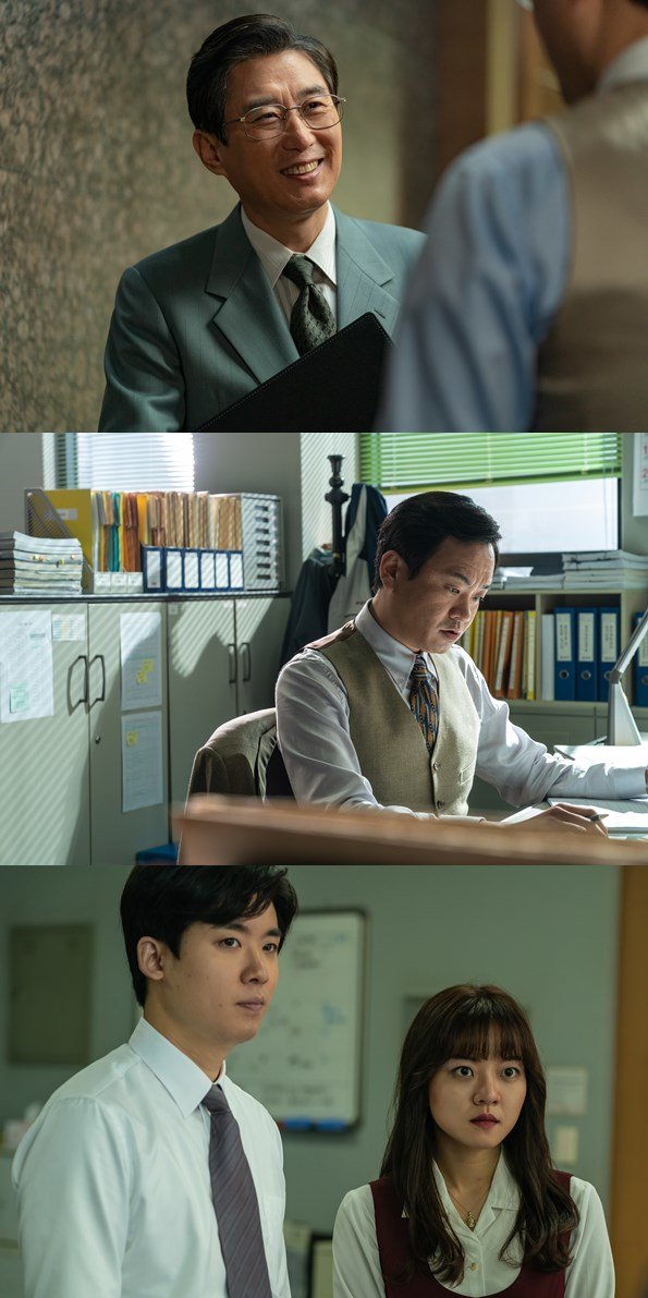 폭넓은 캐릭터 소화력으로 TV와 스크린을 오가며 독보적인 존재감을 발휘해온 김원해는 영화 속 발단이 되는 폐수 유출 사건의 중심, 생산관리3부의 ‘안기창’ 부장 역을 맡았다. 출세에 유리한 줄을 서기 위해 임원들을 대할 때 아부가 담긴 웃음을 짓는 모습으로 전형적인 조직형 인간이라는 특징을 사실감 있게 그려냈다. 부장과 사원들 사이에서 실질적으로 업무를 관리하는 ‘홍수철’ 과장 역의 이성욱은 생산관리3부를 듬직하게 이끌어가는 유능한 인물을 현실감 넘치게 연기, 이번 작품에서도 농익은 연기력을 선보였다. ‘홍수철’ 과장에게 늘 깨지는 통에 뭐든 수첩에 기록하지만, 사소한 업무까지 말단 사원인 ‘자영’(고아성)이 챙겨줘야 하는 ‘최동수’ 대리 역은, 자연스럽게 녹아드는 조현철의 연기로 관객들에게 소소한 웃음과 공감을 선사할 것이다.