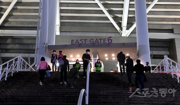 국가대표 A매치를 보기 위해 경기장을 찾은 축구팬들이 계단을 오르고 있다.