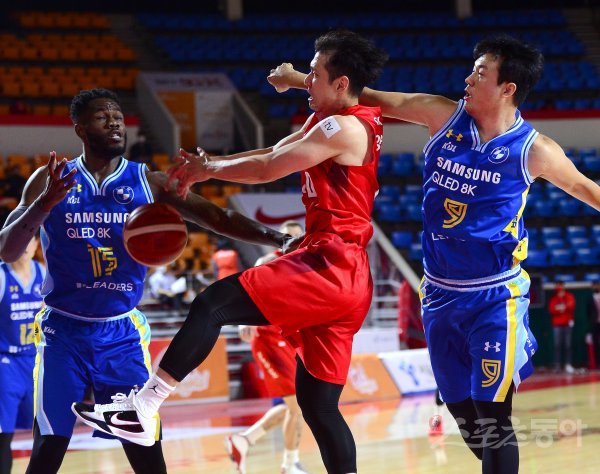 12일 서울 잠실학생체육관에서 열린 ‘2020-2021 현대모비스 프로농구’ 서울 SK와 서울 삼성 경기에서 SK 양우섭과 삼성 김동욱이 리바운드 볼을 다투고 있다.