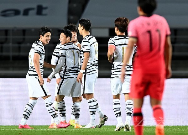 축구대표팀 이동경이 골을 넣은 뒤 동료들과 기쁨을 나누고 있다.