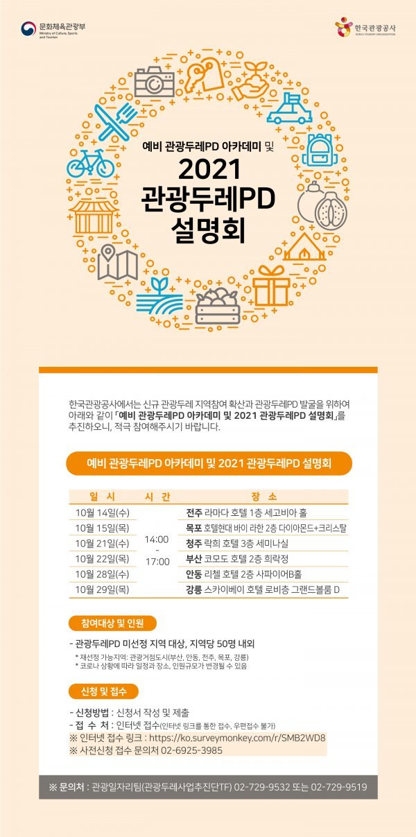 코로나19 감염 예방을 위해 지역별로 50명 내외로 참가인원을 제한하며, 13일까지 전용 홈페이지를 이용하거나 현장에서 신청 가능하다. 행사 참가자는 내년도 관광두레PD 지원 시 3점의 가산점을 부여한다.