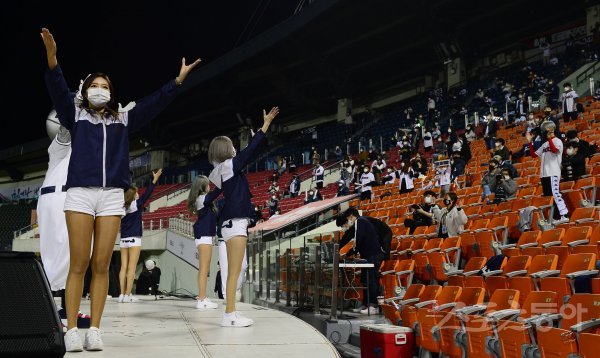 두산 치어리더들이 단상에서 응원을 펼치고 있다.