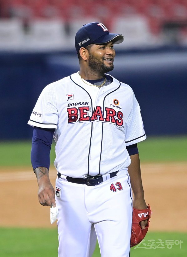 4회초 수비를 마친 뒤 두산 알칸타라가 웃으며 더그아웃으로 향하고 있다.