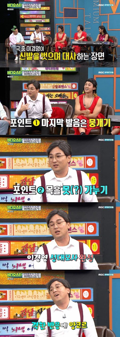 이에 MC들은 “몸을 수그려서 소리를 누르나보다”라고 말했다. 황제성은 “또 말을 할 때 목을 항상 못 가눠야한다. 또 말의 끝은 항상 뭉개줘야 한다”라고 말했다.