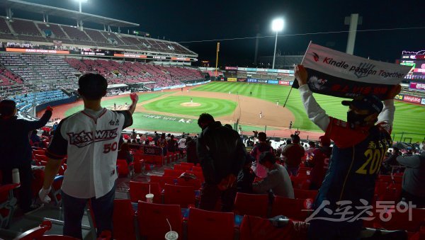 코로나19의 사회적 거리두기가 1단계로 전환되어 전체 관중석의 20% 규모로 관중 입장이 허용돼 팬들이 응원을 펼치고 있다.