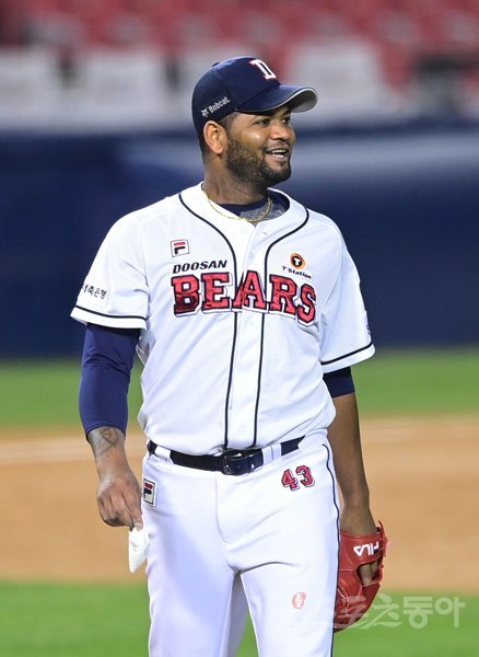 13일 서울 잠실야구장에서 ‘2020 신한은행 SOL KBO리그’ 두산 베어스와 한화 이글스의 경기가 열렸다. 4회초 수비를 마친 뒤 두산 알칸타라가 웃으며 더그아웃으로 향하고 있다. 잠실|주현희 기자 teth1147@donga.com