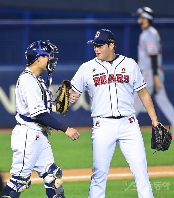 두산이 한화에 5-0으로 승리를 거둔 뒤 김강률과 박세혁이 기쁨을 나누고 있다.