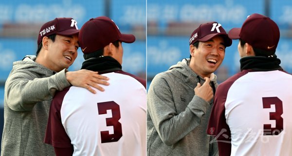경기 전 키움 김창현 감독대행이 김혜성과 이야기를 나누고 있다.