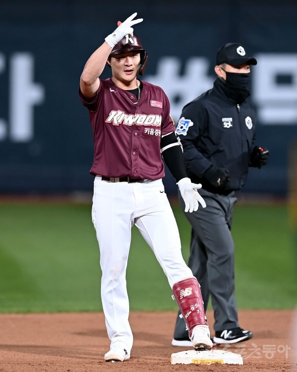 4회초 2사 1, 2루에서 키움 김하성이 1타점 2루타를 날린 뒤 세리머니를 펼치고 있다.