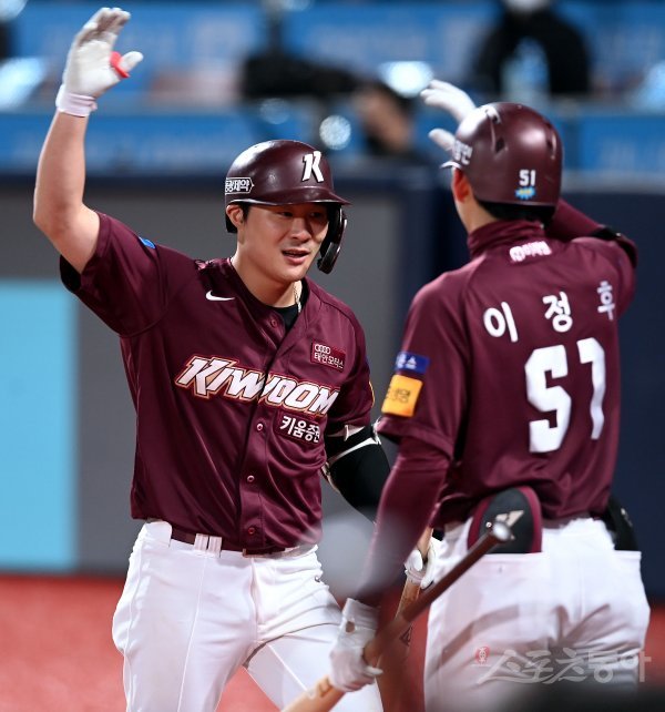6회초 무사에서 키움 김하성이 솔로 홈런을 쏘아 올린 뒤 이정후와 기쁨을 나누고 있다.
