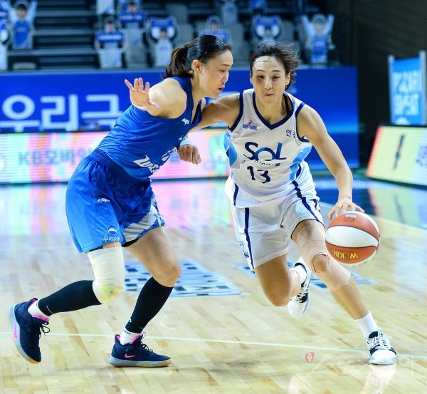 15일 아산이순신체육관에서 열린 ‘KB국민은행 Liiv M 2020-21 여자프로농구‘ 우리은행과 신한은행 경기에서 신한은행 김단비가 우리은행 김정은의 수비를 뚫고 골밑을 공격하고 있다.