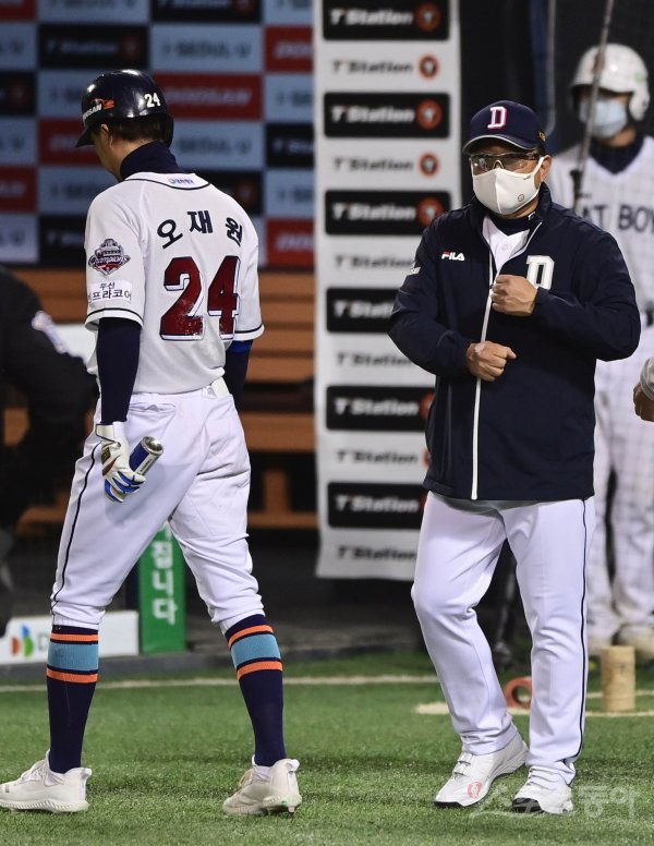 6회말 2사 1루 무릎 통증을 호소하는 두산 오재원에게 김태형 감독이 교체를 지시하고 있다.