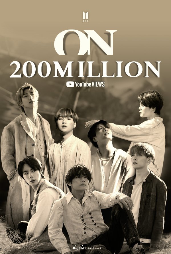지난 2월 28일 공개된, 방탄소년단 정규 4집 ‘MAP OF THE SOUL : 7’ 타이틀곡 ‘ON’의 두 번째 뮤직비디오 유튜브 조회수가 10월 16일 오전 12시 59분경 2억 건을 넘었다.