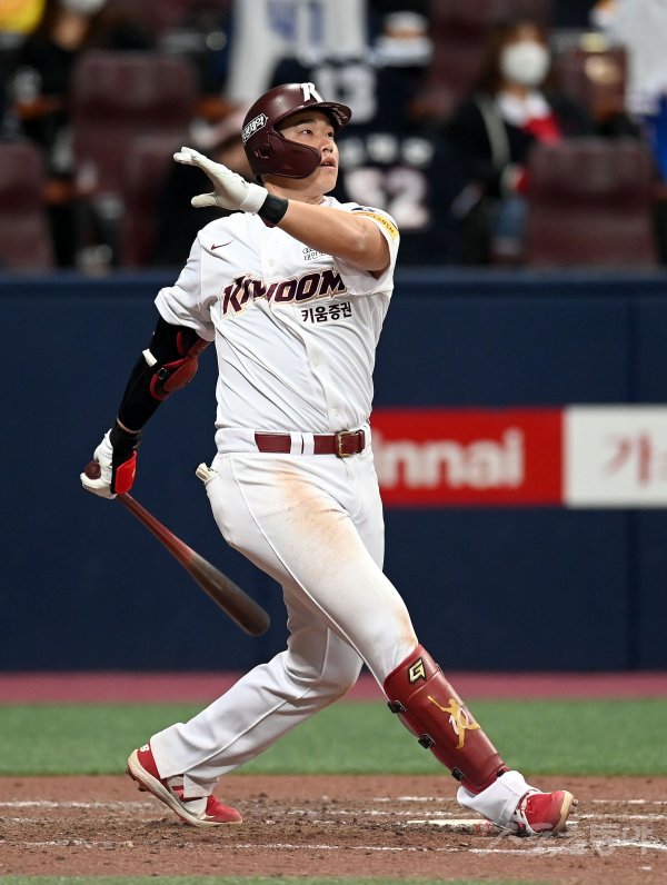 18일 서울 고척스카이돔에서 ‘2020 신한은행 SOL KBO 리그’ 두산 베어스와 키움 히어로즈 경기가 열렸다. 6회말 2사 1루 키움 김웅빈이 1타점 중전 2루타를 치고 있다. 고척 | 김종원 기자 won@donga.com