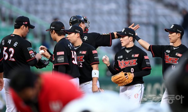kt가 SK에 7-5로 승리한 뒤 선수들이 그라운드에서 기쁨을 나누고 있다.