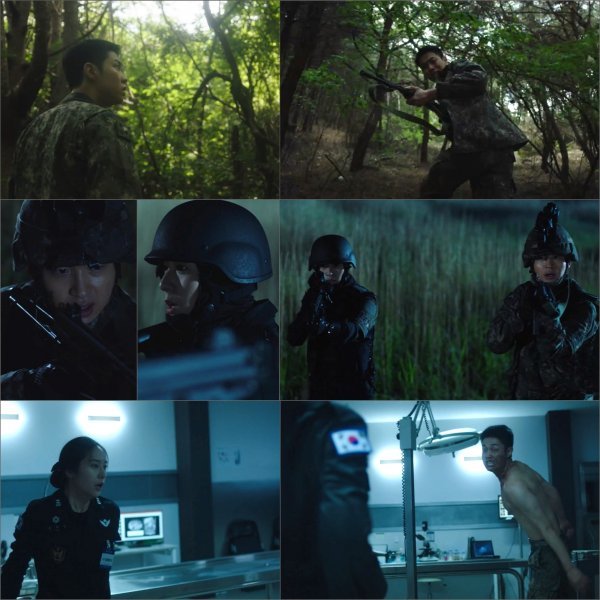제작진은 “정찰추적견 ‘레오’를 따라가던 용동진 병장(장동윤)과 손예림 중위(정수정)는 들판 한가운데서 정체를 알 수 없는 미지의 적과 정면으로 마주쳤다. 용병장과 손중위 모두 물러서지 않고 그를 향해 총구를 겨누며 “정지, 움직이면 쏜다”라며 경고했지만, 미동도 없는 적은 서서히 이들 앞에 모습을 드러내다 눈 깜짝할 새 자취를 감추며 스산한 기운만 남겼다. 기척은 확실하지만 정체는 불확실한 적의 등장은 보는 이들까지도 긴장하게 만들었다. 사람이 아닌 것 같은 적의 형체에 “방금 그거 뭐야?”라며 되묻는 손중위와 눈앞에 벌어진 상황을 믿지 못하겠다는 듯 “나도 모르겠어”라고 답하는 용병장 대화는 적에 대한 궁금증을 증폭시켰다”고 이야기했다.