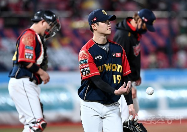 4회초 1사 1, 2루에서 kt 선발 배제성이 교체되고 있다.