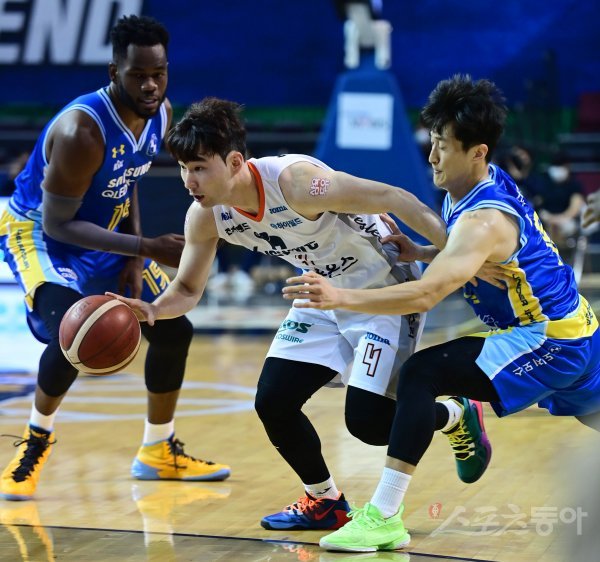 20일 서울 잠실실내체육관에서 열린 ‘2020-2021 현대모비스 프로농구’ 서울 삼성과 인천 전자랜드의 경기에서 전자랜드 김낙현이 삼성 김광철의 수비를 뚫고 드리블 돌파를 하고 있다.