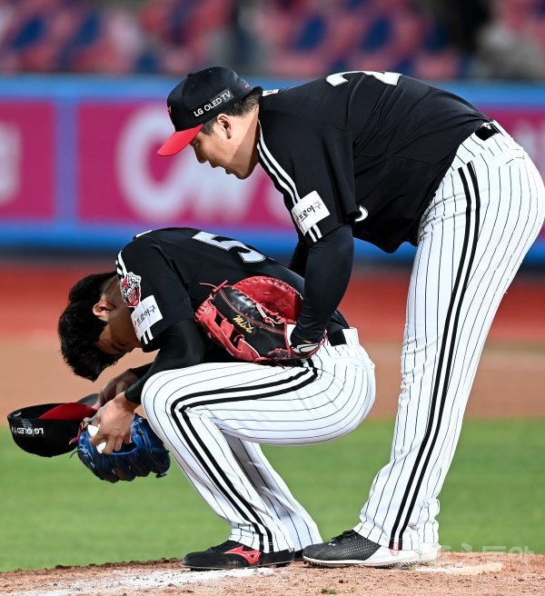 6회말 2사 만루에서 kt 문상철을 아웃시킨 LG 정우영이 마운드에서 고개를 숙이자 김현수가 격려하고 있다.