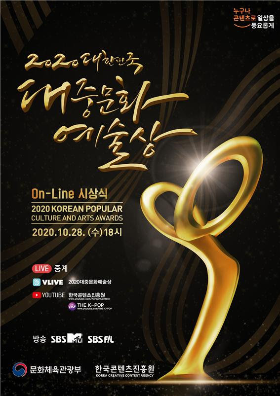 문화체육관광부(장관 박양우, 이하 문체부)가 주최하고 한국콘텐츠진흥원(원장 김영준, 이하 콘진원)이 주관하는 ‘2020 대한민국 대중문화예술상’이 오는 28일 온라인 시상식으로 개최된다.