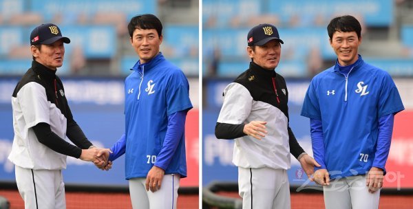 21일 경기도 수원 KT위즈파크에서 ‘2020 신한은행 SOL KBO리그’ KT 위즈와 삼성 라이온즈의 경기가 열린다. 경기 전 훈련에서 KT 이강철 감독과 삼성 허삼영 감독이 악수하며 이야기를 하고 있다.