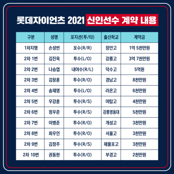 먼저 장안고 출신의 1차 지명 손성빈과는 1억 5000만원에 계약했다. 강한 어깨와 순발력을 갖춘 중장거리형 타자로, 고교 시절 팀의 주장을 맡아 다방면에서 고른 활약을 선보인 바 있다.