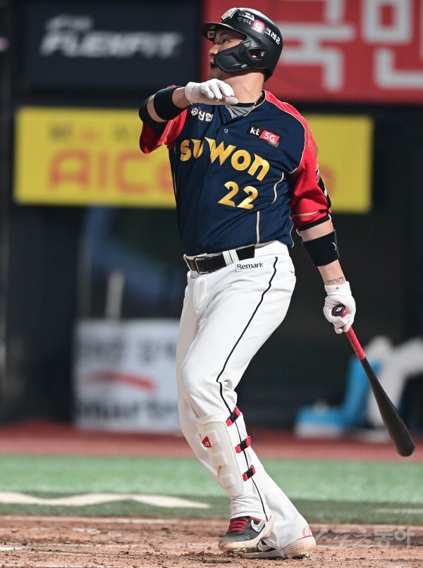 2회말 무사 KT 장성우가 선취 좌월 솔로 홈런을 치고 있다.