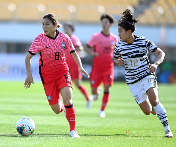 여자 축구 국가대표팀과 20세 이하(U-20) 여자 축구대표팀이 22일 경기도 파주스타디움에서 평가전을 가졌다. 국가대표팀 이세진이 U-20대표팀 김수진의 수비를 뚫고 공격을 하고 있다.