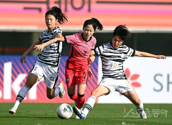 여자 축구 국가대표팀과 20세 이하(U-20) 여자 축구대표팀이 22일 경기도 파주스타디움에서 평가전을 가졌다. 여자 대표팀 이민아가 U-20 대표팀 수비를 뚫고 공격을 하고 있다.