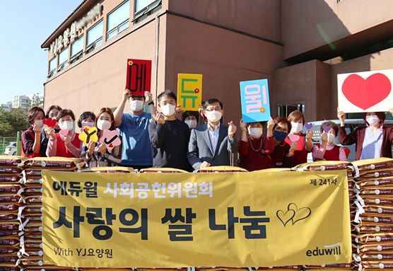 에듀윌 사회공헌위원회가 지난 20일 경기도 파주시에 위치한 YJ요양원에 ‘사랑의 쌀’ 100포대를 기증했다. 노인전문요양 시설인 YJ요양원은 의료 재활 서비스와 간호간병 및 다양한 자원 봉사 프로그램까지 폭넓은 요양 프로그램을 운영하는 기관이다.