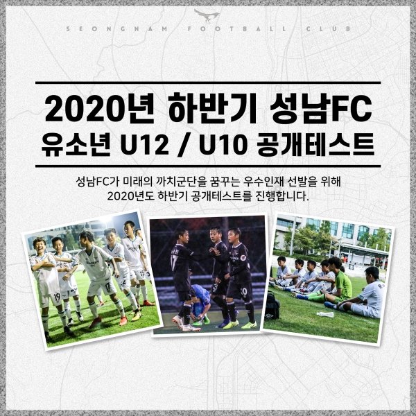테스트는 11월 2일(월)부터 5일(목)까지 연령대 별로 성남시 탄천변 B구장과 상대원유소년축구장에서 진행된다. 공개테스트 참가 신청은 10월 30일(금) 오후 3시까지 가능하다.