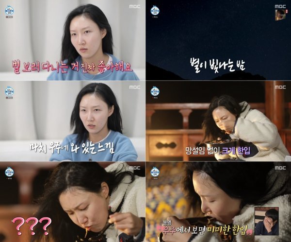 목적지에 도착한 화사는 별이 가득한 밤하늘을 보며 감탄했다. 그는 “전망대가 필요 없었다. 모든 곳이 전망대였다”며 “모든 도시 소음이 사라지고 내 시야에는 깜깜한 밤하늘만 있었다. 우주에 와 있는 느낌이었다. 혼자 보기 너무 아깝더라. 누구라도 데리고 올걸”이라고 털어놨다.