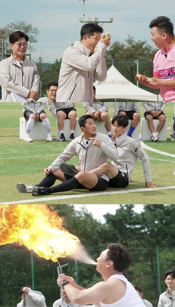 먼저 무 갈기의 대명사 ‘갈갈이’ 박준형은 무와 사과를 준비해 직접 앞니로 갈아내는 추억의 개인기로 보는 이들의 눈을 사로잡는다. 뿐만 아니라 쌍둥이 개그맨 이상호, 이상민 역시 찰떡 호흡으로 이들의 시그니처 개그였던 2인조 아크로바틱을 선보이며 ‘어쩌다FC\'의 기선을 제압한다.