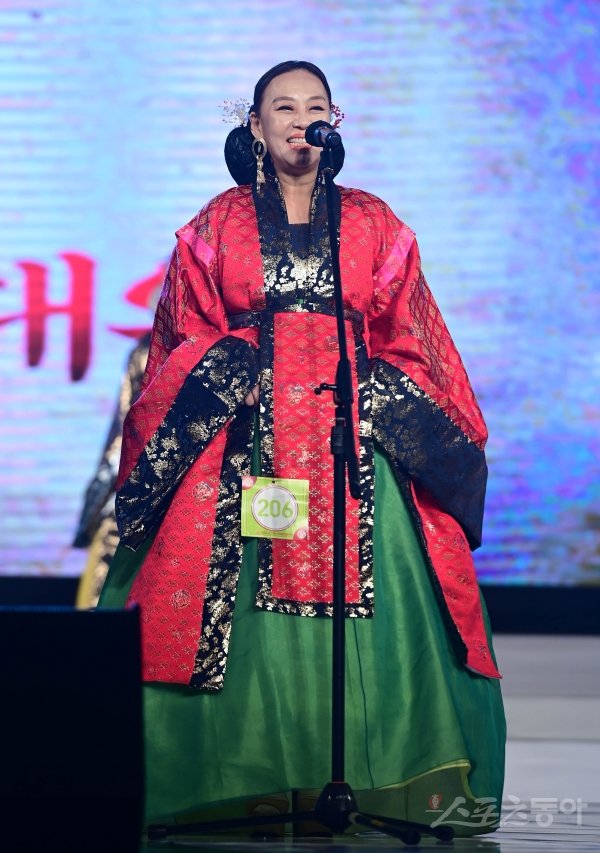 24일 서울 광진구 광장동 워커힐 서울에서 열린 ‘소서노 여대왕 2020’ 선발대회에서 시니어 부문 기호 206번 강정희가 자기소개를 하고 있다. 우리나라 최초이자 유일한 여성 건국자인 ‘소서노 여대왕’을 널리 알리고 업적을 계승, 발전시키기 위한 ‘소서노 여대왕 선발대회’는 백제의상 한복모델 선발대회다. 총 4개 부문으로 대회가 치러지며 각 부문 수상자들은 백제문화 및 대한민국의 홍보대사로 활동하며 현대 여성상을 반영하여 수익금 일부 기부와 사회적 약자인 불우이웃을 돕기 위한 각종 봉사활동을 진행하는 자선대회로 진행될 예정이다.