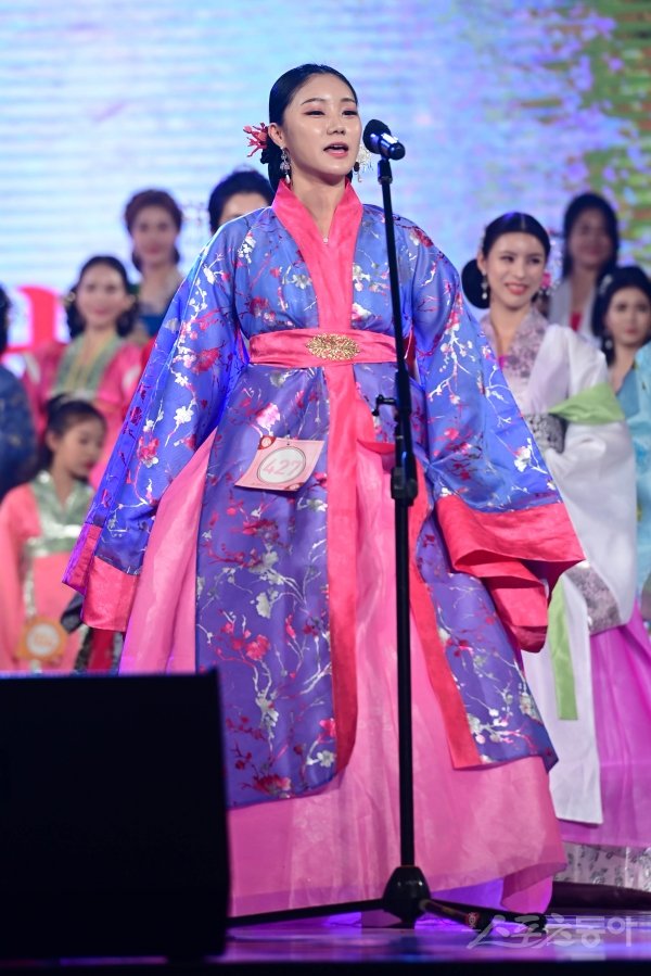 24일 서울 광진구 광장동 워커힐 서울에서 열린 ‘소서노 여대왕 2020’ 선발대회에서 미스 부문 기호 427번 양혜인이 자기소개를 하고 있다. 우리나라 최초이자 유일한 여성 건국자인 ‘소서노 여대왕’을 널리 알리고 업적을 계승, 발전시키기 위한 ‘소서노 여대왕 선발대회’는 백제의상 한복모델 선발대회다. 총 4개 부문으로 대회가 치러지며 각 부문 수상자들은 백제문화 및 대한민국의 홍보대사로 활동하며 현대 여성상을 반영하여 수익금 일부 기부와 사회적 약자인 불우이웃을 돕기 위한 각종 봉사활동을 진행하는 자선대회로 진행될 예정이다.