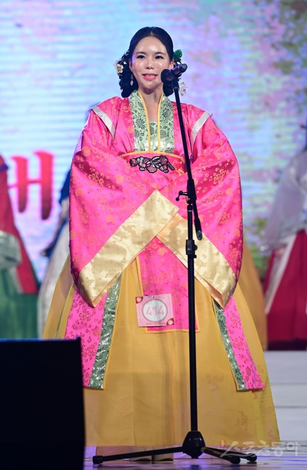 24일 서울 광진구 광장동 워커힐 서울에서 열린 ‘소서노 여대왕 2020’ 선발대회에서 미스 부문 기호 414번 길유경이 자기소개를 하고 있다. 우리나라 최초이자 유일한 여성 건국자인 ‘소서노 여대왕’을 널리 알리고 업적을 계승, 발전시키기 위한 ‘소서노 여대왕 선발대회’는 백제의상 한복모델 선발대회다. 총 4개 부문으로 대회가 치러지며 각 부문 수상자들은 백제문화 및 대한민국의 홍보대사로 활동하며 현대 여성상을 반영하여 수익금 일부 기부와 사회적 약자인 불우이웃을 돕기 위한 각종 봉사활동을 진행하는 자선대회로 진행될 예정이다.