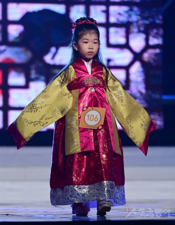 24일 서울 광진구 광장동 워커힐 서울에서 열린 ‘소서노 여대왕 2020’ 선발대회에서 키즈 부문 기호 106번 김수연이 워킹을 하고 있다. 우리나라 최초이자 유일한 여성 건국자인 ‘소서노 여대왕’을 널리 알리고 업적을 계승, 발전시키기 위한 ‘소서노 여대왕 선발대회’는 백제의상 한복모델 선발대회다. 총 4개 부문으로 대회가 치러지며 각 부문 수상자들은 백제문화 및 대한민국의 홍보대사로 활동하며 현대 여성상을 반영하여 수익금 일부 기부와 사회적 약자인 불우이웃을 돕기 위한 각종 봉사활동을 진행하는 자선대회로 진행될 예정이다.