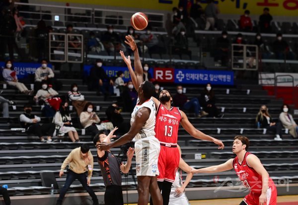 25일 경기 고양시 일산서구 고양체육관에서 열린 ‘2020-2021 현대모비스 프로농구’ 고양 오리온과 인천 전자랜드의 경기에서 고양 오리온 로슨과 인천 전자랜드 심스가 관중들 앞에서 점프볼을 하고 있다.