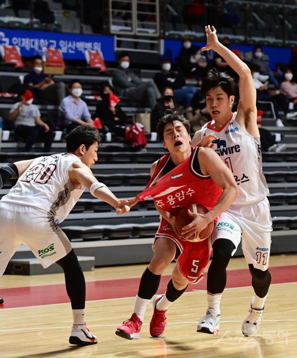 25일 경기 고양시 일산서구 고양체육관에서 열린 ‘2020-2021 현대모비스 프로농구’ 고양 오리온과 인천 전자랜드의 경기에서 고양 오리온 한호빈이 인천 전자랜드 정영삼에게 유니폼을 잡히고 있다.
