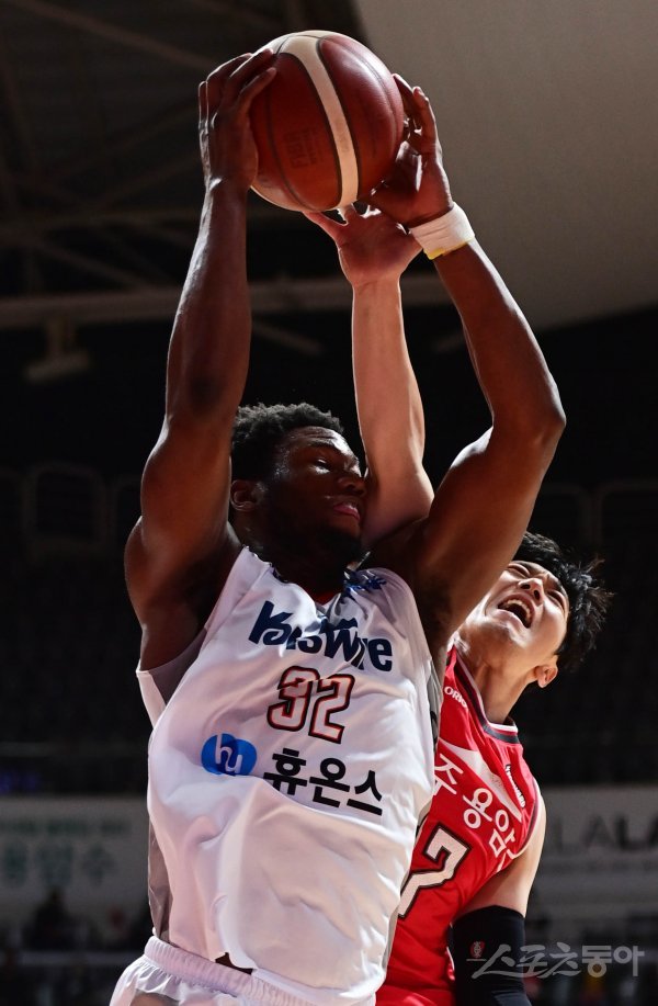 25일 경기 고양시 일산서구 고양체육관에서 열린 ‘2020-2021 현대모비스 프로농구’ 고양 오리온과 인천 전자랜드의 경기에서 인천 전자랜드 탐슨과 고양 오리온 박재현이 리바운드 다툼을 하고 있다.