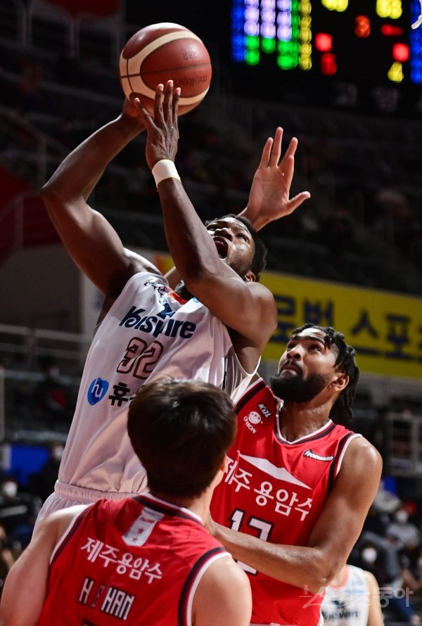 25일 경기 고양시 일산서구 고양체육관에서 열린 ‘2020-2021 현대모비스 프로농구’ 고양 오리온과 인천 전자랜드의 경기에서 인천 전자랜드 탐슨이 로슨의 앞에서 슛을 쏘고 있다.
